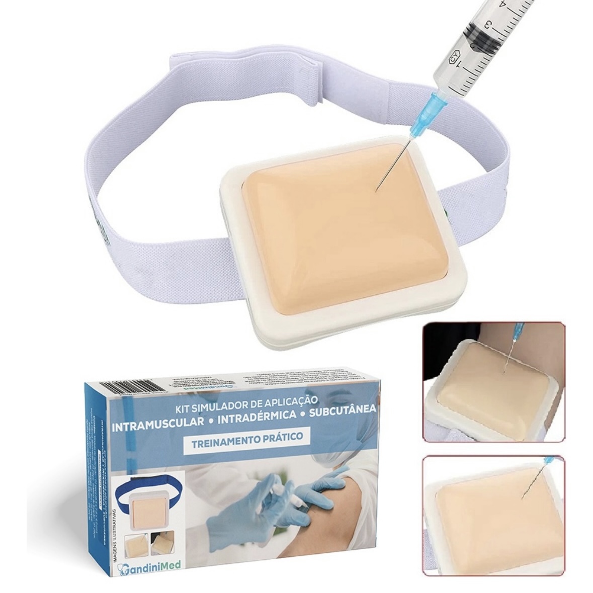 Este kit inclui uma almofada de treinamento de injeção, confeccionada com materiais duráveis como plástico, silicone e esponja, seringas e agulhas esterilizadas.